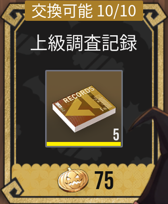 |  上級調査記録 | 【優先度】★★☆☆☆ 交換に必要なメダル数:75 交換1回あたりのアイテム数:5 交換上限回数:10回 |