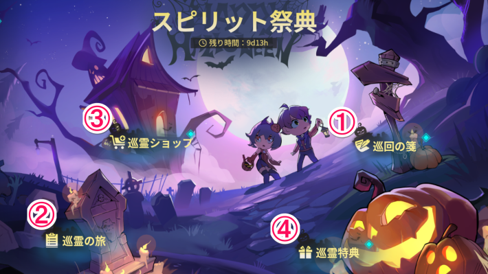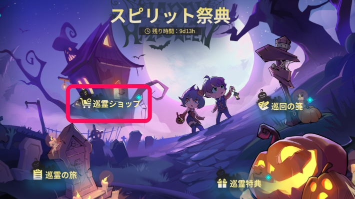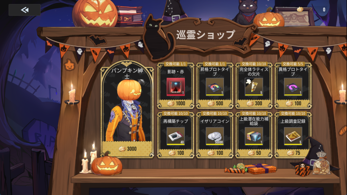 「巡霊ショップ」は巡霊ポイントとアイテムを交換できるイベントショップです。貴重な育成素材や、ハロウィンモチーフのハイパーリンカースキンを交換可能です。