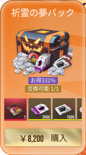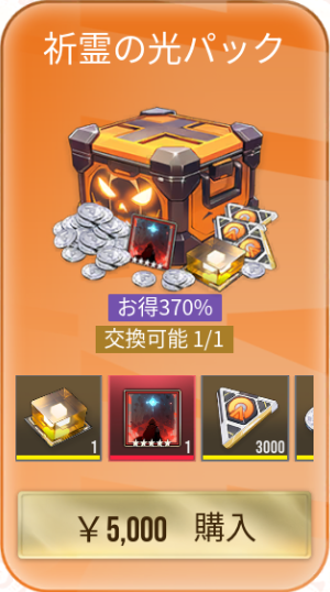 |  祈霊の夢パック | 【おすすめ度】★★★☆☆ 値段:8,200 購入上限回数:1回 【内容物】 跳格原型×1 源質Pt×3,000 源器エッセンス×1,000 イザリアコイン×200,000 |