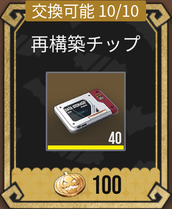 |  再構築チップ | 【優先度】★★★☆☆ 交換に必要なメダル数:100 交換1回あたりのアイテム数:40 交換上限回数:10回 |