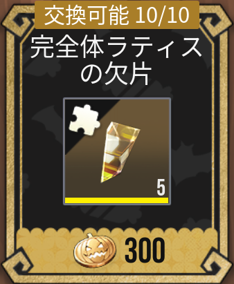 |  完全体ラティス の欠片 | 【優先度】★★★★★ 交換に必要なメダル数:300 交換1回あたりのアイテム数:5 交換上限回数:10回 |