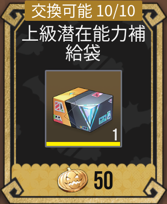 |  上級潜在能力補給袋 | 【優先度】★★★☆☆ 交換に必要なメダル数:50 交換1回あたりのアイテム数:1 交換上限回数:10回 |