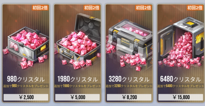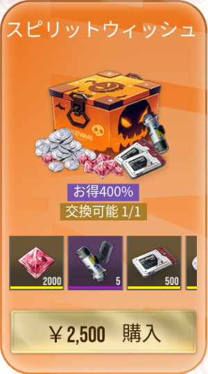 |  スピリット ウィッシュ | 【おすすめ度】★★★★★ 値段:2,500 購入上限回数:1回 【内容物】 ヒドラクリスタル×2000 精神安定剤×5 再構築チップ×500 イザリアコイン×100,000 クリスタルだけを見ても2倍クリスタルと同等のコスパです。 |