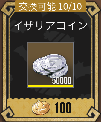 |  イザリアコイン | 【優先度】★★☆☆☆ 交換に必要なメダル数:100 交換1回あたりのアイテム数:50,000 交換上限回数:10回 |