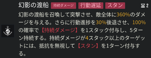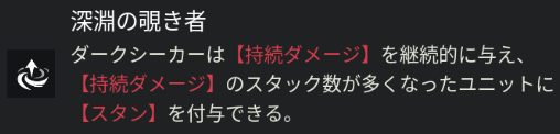 ダークシーカーは1ターンおきにスキル2を発動し、味方全体に100%の確率で【持続ダメージ】を付与。また、攻撃対象が持続ダメージを4スタック以上持つ場合は確定でスタンを付与します。
