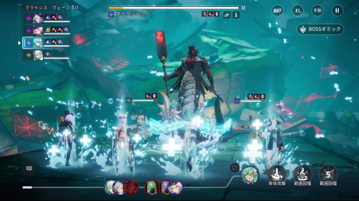 ダークシーカー戦では継続的に【持続ダメージ】を解除するのが重要です。リョウラやサニアといったデバフ解除の手数が多いキャラを編成しましょう。