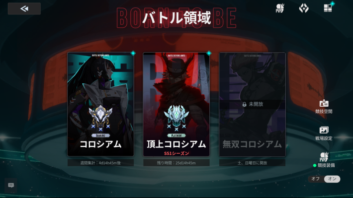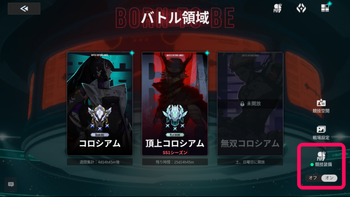 競技装備を使用するには、まずは機能をオンにしましょう。バトル領域トップメニュー画面の右下、競技装備の下の「オフ/オン」をタップすることで機能の無効/有効を切り替えられます。