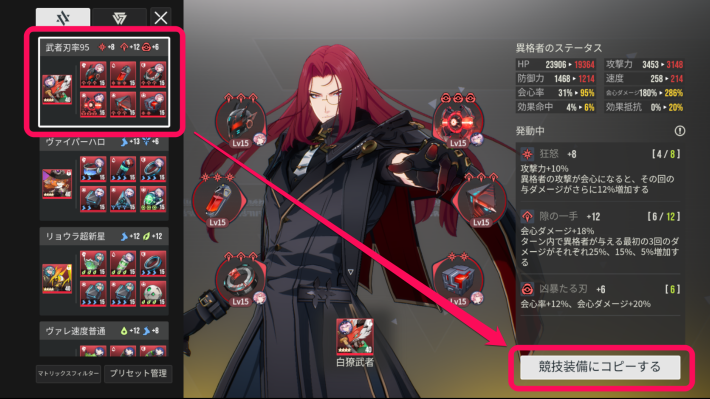 コピーしたいプリセットを選択して、画面右下の「競技装備にコピーする」をタップすることでコピー完了です。