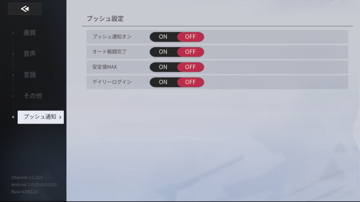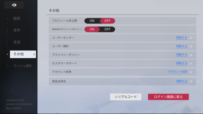 その他タブの項目も好みに応じて変更でOK。ここでは設定だけでなく、カスタマーサポートへのアクセスやゲームやアカウントに関わる各種情報の閲覧も可能です。
