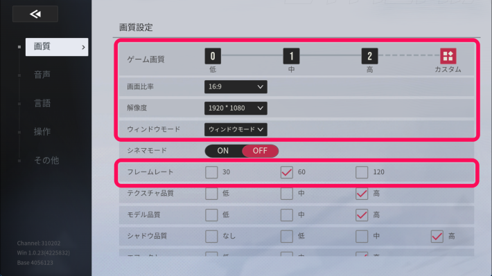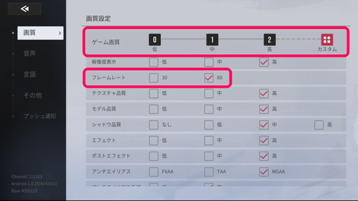 画質設定は基本的に「ゲーム画質」と「フレームレート」の項目のみの変更でOKです。
