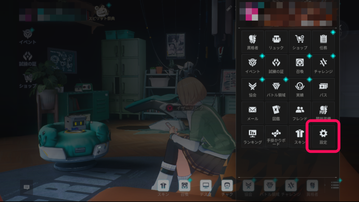 設定画面はメインメニューの「設定」をタップすることで開くことができます。設定の開き方はスマホ版とPC版どちらも同じです。