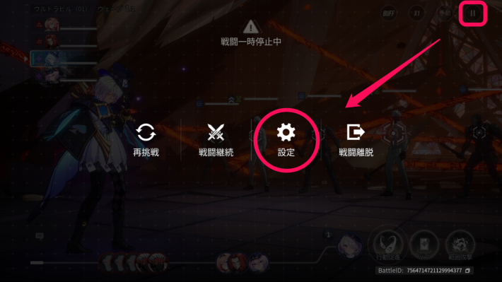 画質設定や音声設定といった一部の設定は、戦闘中にも変更することができます。画面右上のメニューアイコンから戦闘を一時停止し、「設定」をタップしましょう。