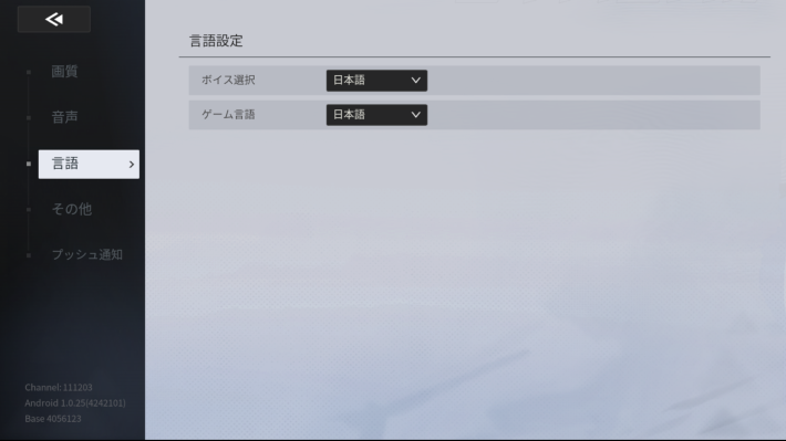 言語設定は好みによって選択してください。ボイス言語はキャラクターのボイスの言語、ゲーム言語はゲーム内で表示される言語の設定です。