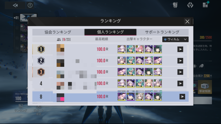 メニュー左下の「ランキング」からその日の協会メンバーの挑戦記録を確認可能です。編成やビルドも見ることができます。