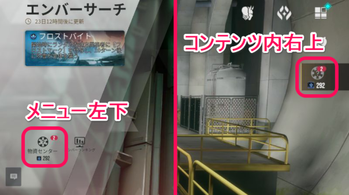 レイボズ物資センターはエンバーサーチメニュー画面左下、コンテンツ内画面右上からアクセス。