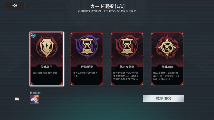 異格者/ボス戦では戦闘開始前にこちらが不利になるカードを選択。階層が進むほど選択しなければならない枚数が増加します。