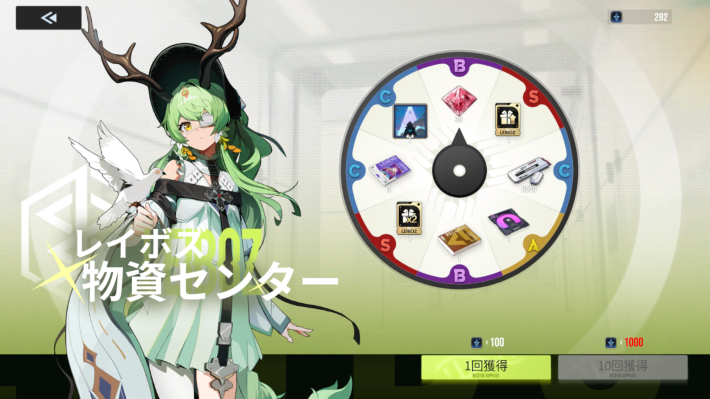 エンバーサーチのプレイで手に入る「レイボズ物資Pt」を使用して報酬ルーレットを回すことができます。レイボズ物資Pt100Ptで1回まわし、ランダムなアイテムをひとつ獲得可能です。