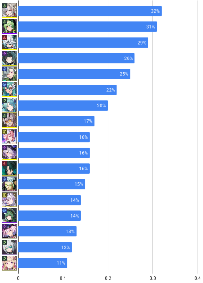 現状最も使用率が高いキャラはヒーラーの拂秋です。味方の行動進捗増加効果を持ち、特にレイメリーやティアマトといった耐久アタッカーを主力にする場合のヒーラーとして採用されています。