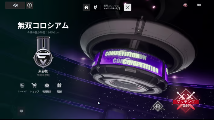 無双コロシアムは8人で同時にマッチングするトーナメント式のリアルタイムPvP。戦闘システムは頂上コロシアムと同じものになっています。