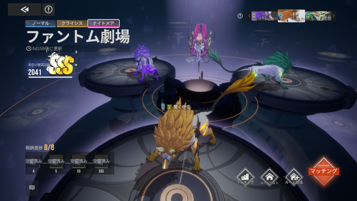 ファントム劇場は他プレイヤーとマッチングし、2人で協力して挑戦する戦闘コンテンツ。自分のパーティーを1編成、共同パーティーを1編成の2人合計3パーティーでボスと戦い高スコアを目指します。