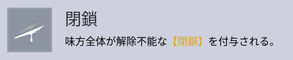 閉鎖 | 味方全体に永続/解除不可の【閉鎖】を付与 |