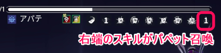 召喚されるパペットによってアパテが発動するスキルは大きくバフ型とデバフ型の2種類に分類可能です。左のパペットが残るとバフ型スキルが、右のパペットが残るとデバフ型スキルが発動します。