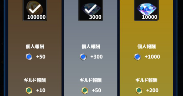 毎週ギルドランキングに応じてダイヤをもらうことができる。ある程度活動しているギルドなら毎週20,000ダイヤ以上もらえるので、できるだけ強いギルドに所属するのがオススメだ。