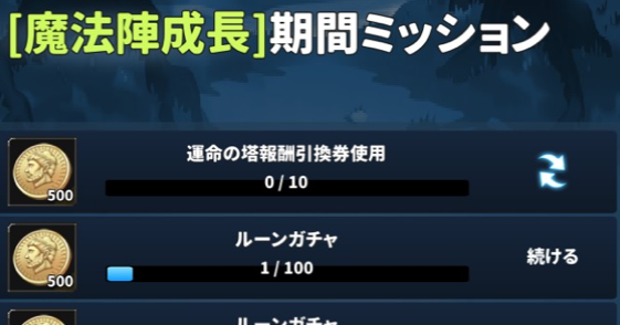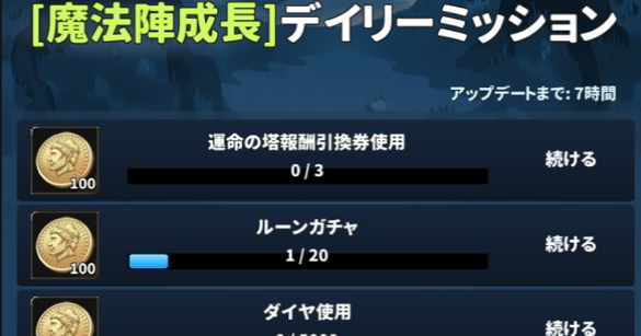 ゲームプレイやダイヤ使用などで達成できるデイリーミッション。達成すると各種ガチャコインなどを手に入れられる。