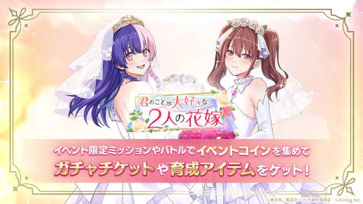 株式会社Aiming(本社:東京都渋谷区、代表取締役社長:椎葉忠志、以下「Aiming」)第2事業部の「Team CARAVAN」は、コスプレバトルRPG『2.5次元の誘惑(リリサ)天使たちのステージ』(略称:リリステ)において、1stアニバーサリーイベント「君のことが大好きな2人の花嫁」を開催することをお知らせいたします。