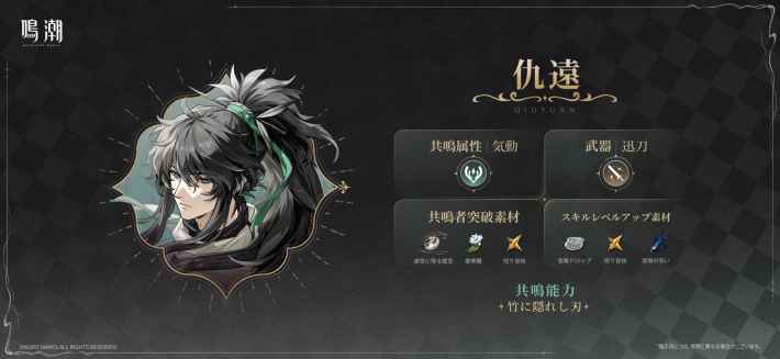 仇遠は生まれつき目が見えないのですが、心のなかに具現化された“竹林”を通して外界を認識する特別な力を持っています。並外れた武芸の才を持っている仇遠は、幼い頃から師匠と共に山林で修行を積むことで、その能力は研ぎ澄まされています。仇遠は気動属性の星5共鳴者で、武器種は迅刀を使います。己の剣技に絶対的な自信を持つ仇遠の身のこなしは、卓越したもので敵を追い詰めていくことができるでしょう。