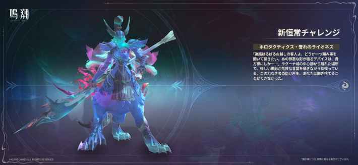 ホロタクティクスに強敵の「誉れのライオネス」が追加されます。かなりの高難易度になると思われるので、腕に自信があるプレイヤーはぜひ挑戦してみましょう。また、主人公たちが装備可能な「音骸」のハーモニーセットとして「インフェルノ・シャドウ」が追加されます。「ナイトメア音骸」と呼ばれる特殊な音骸も追加され、「ナイトメア・熔解トカゲ」、「ナイトメア・トゲバラタケ(幼体)」、「ナイトメア・熔解トカゲ(幼体)」の3体が追加されます。このナイトメア音骸3体は新たに登場するナイトメア集落で入手可能となっています。