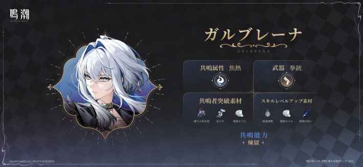 “デビルハンター”の異名を持つガルブレーナ(CV:庄司宇芽香)は、共に行動する音骸「キメラ」の力を借りながら拳銃で戦うキャラクターです。彼女は焦熱属性の星5共鳴者で、彼女は銃を体の各部に構え、自在に射撃を行なうことができるという高い戦闘力を備えています。Ver2.7で登場するハーモニー効果の「インフェルノ・シャドウ」のセット効果がガルブレーナに最適のセット効果だとすれば、ガルブレーナは重撃ダメージと音骸スキルダメージを得意とするメインアタッカーとして活躍してくれるでしょう。