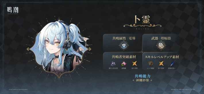 卜霊(CV:千本木彩花)は、占いや風水などに精通するキャラクターです。世界を災害から守るブラックショアの協力者として世界を旅して回っています。卜霊は電導属性の星4共鳴者で、使用する武器種は増幅器。持続ダメージや相手を引き寄せる技を駆使して、卜霊は戦います。Ver2.8後半の復刻限定ガチャに星4ピックアップとして、卜霊は新規プレイアブルキャラクターとなります。