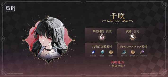 千咲(CV:金元寿子)は、制服姿が印象的なキャラクターです。自分のことは一介の学生として多くを語ろうとしない一方で、優れた能力と冷静沈着な性格は彼女のミステリアスな雰囲気を際立たせます。千咲は消滅属性の星5共鳴者で、使用する武器種は長刃です。千咲の武器はハサミのような形をしており、身の丈ほどもある武器を彼女は軽やかに扱うことが可能です。戦闘ではマーキングした敵を引き寄せるほか、味方の回復もできるなど多種多様な技を駆使して戦うキャラクターとなっています。