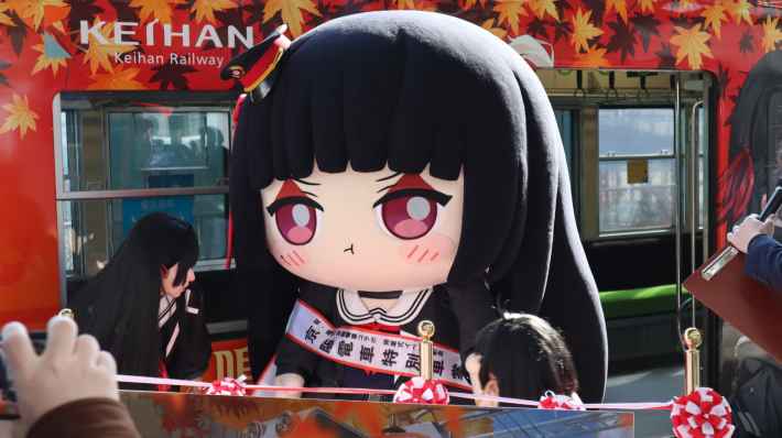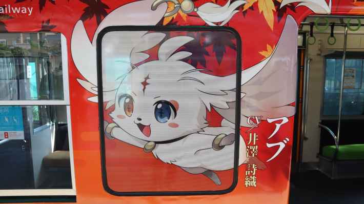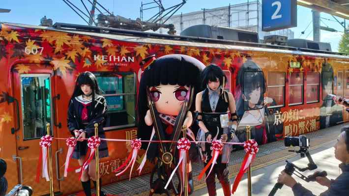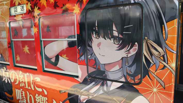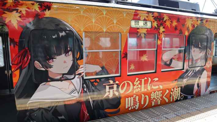 ラップング電車は京都の紅葉と千咲、漂泊者、アブが描かれた日本らしいデザインに。