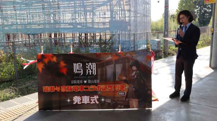 発車式では、テープカットや千咲プレートの設置などのお約束行事も。鳴潮が日本の列車になって街中を走るのは、非常に感慨深い。(初期勢筆者)