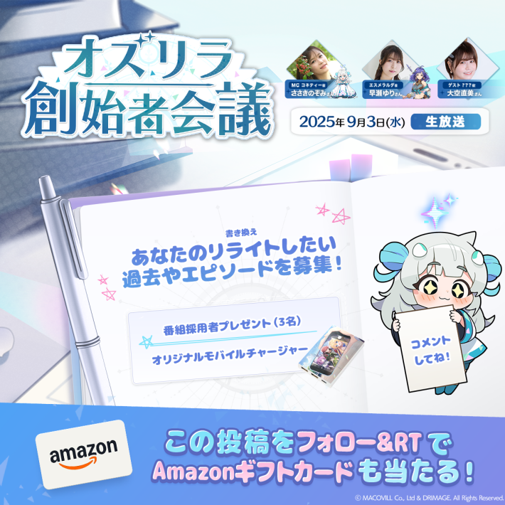 ニコニコ生放送YouTubeBTSやSEVENTEENなど世界的アーティストを擁するエンターテインメントライフスタイルプラットフォーム企業HYBEのゲーム事業部門である株式会社DRIMAGE(所在地:韓国ソウル、代表取締役CEO:チョン・ウヨン)ならびに日本法人株式会社DRIMAGE JAPAN(所在地:日本東京、代表取締役社長:中西 啓太)は、MACOVILL(代表取締役:イ・ジュヒョン)が開発する“絆から始まる、あなたの物語”スマートフォン向け新作アニメRPG「OZ Re:write(オズ リライト)」(以下、オズリラ)について、正式サービス開始後初となる公式生放送『オズリラ創始者会議』の実施を決定しました。『オズリラ創始者会議』はみなさんのコメントで完成する生放送として、2025年9月3日(水)20時より配信します。