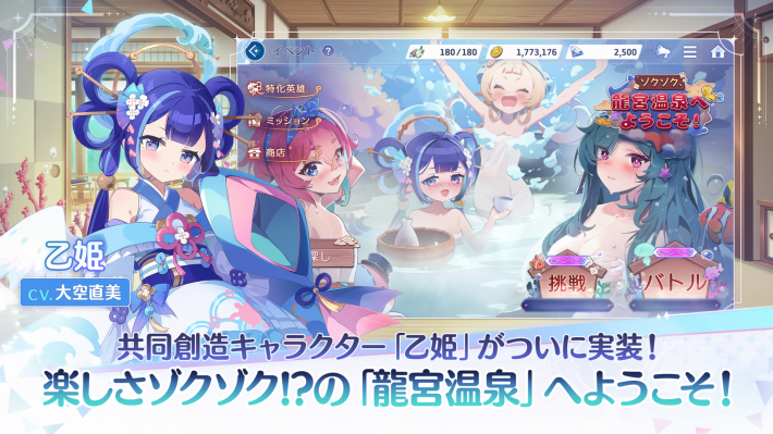 本日実施した温泉アップデートにおきまして、「共同創造プロモーション」出身キャラクター「乙姫」が遂に実装となりました。