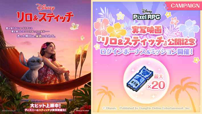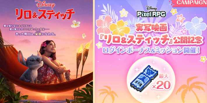 「iOS」および「Android™」端末向けに好評配信中のスマートフォン向けRPG『ディズニー ピクセルRPG』は、ディズニー最新作、実写版『リロ&スティッチ』の公開を記念して、2025年6月18日(水)より、期間限定のログインボーナスとミッション、プレゼントキャンペーンを実施いたします。