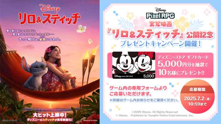 抽選で5,000円分のディズニーストア ギフトカードが当たる「実写映画『リロ&スティッチ』公開記念プレゼントキャンペーン」を本日より開催いたします。『ディズニー ピクセルRPG』のアプリを起動して、ゲーム内「お知らせ」の「専用フォーム」より、必要事項をご記入の上、ご応募いただけます。皆様、ぜひ、奮ってご参加ください。