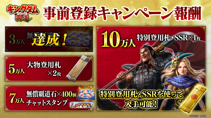 株式会社バンダイナムコエンターテインメントは、App Store/Google Play向け新作スマートフォンアプリ「キングダム 覇道」にて、事前登録開始より6日間で、事前登録数が3万人を突破したことをお知らせいたします。事前登録者数に応じてゲーム開始時に豪華報酬がもらえるキャンペーンもまだまだ実施中です。