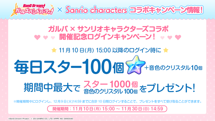 11月10日(月)15時以降にログインすることで、毎日「スター100個」と「音色のクリスタル10個」が手に入り、10日間で最大「スター1000個」と「音色のクリスタル100個」をプレゼントいたします。