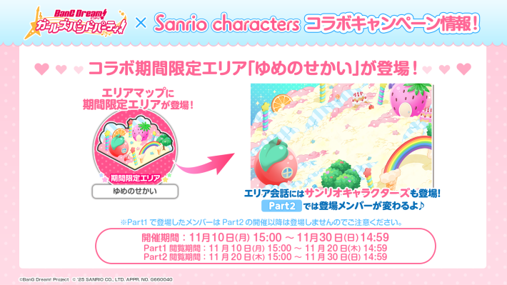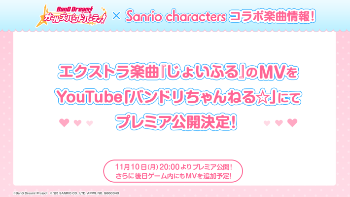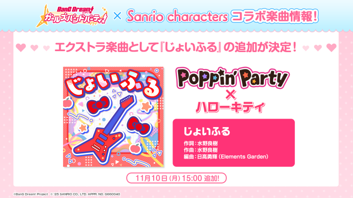 コラボの開催を記念し、11月10日(月)15時に、Poppin'Partyとハローキティの歌うエクストラ楽曲『じょいふる』の追加が決定いたしました。