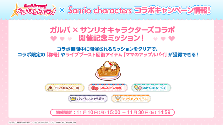 11月10日(月)15時から「ガルパ×サンリオキャラクターズコラボ開催記念ミッション!」を開催いたします。