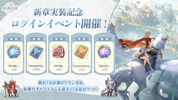新章「羽の国」を記念して、特別ログインイベントの開催が決定!累計14日間ログインするだけで、各種ガチャに使えるアイテムを最大でなんと118回分ゲット!この機会に、幻獣や強力なスキルを手に入れよう。羽の国の幕開けとともに、あなたの旅路に追い風を――。この世界に、新たな足跡を刻もう。