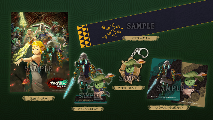 『ゼルダ無双 封印戦記』のTREASURE BOX版は、パッケージ版ソフトに加えマフラータオル、B2布ポスター、ウッドキーホルダー、アクリルフィギュア、A4クリアシート2枚セットが同梱される。
