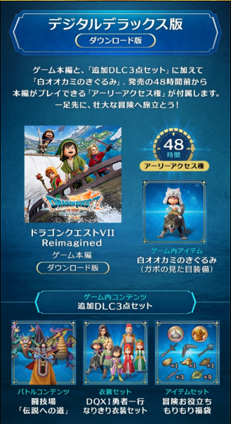 ドラゴンクエストVII Reimaginedのデジタルデラックス版は、ダウンロード版のみの発売で特典として「追加DLC3種」や「48時間アーリーアクセス権」などがついてくる。