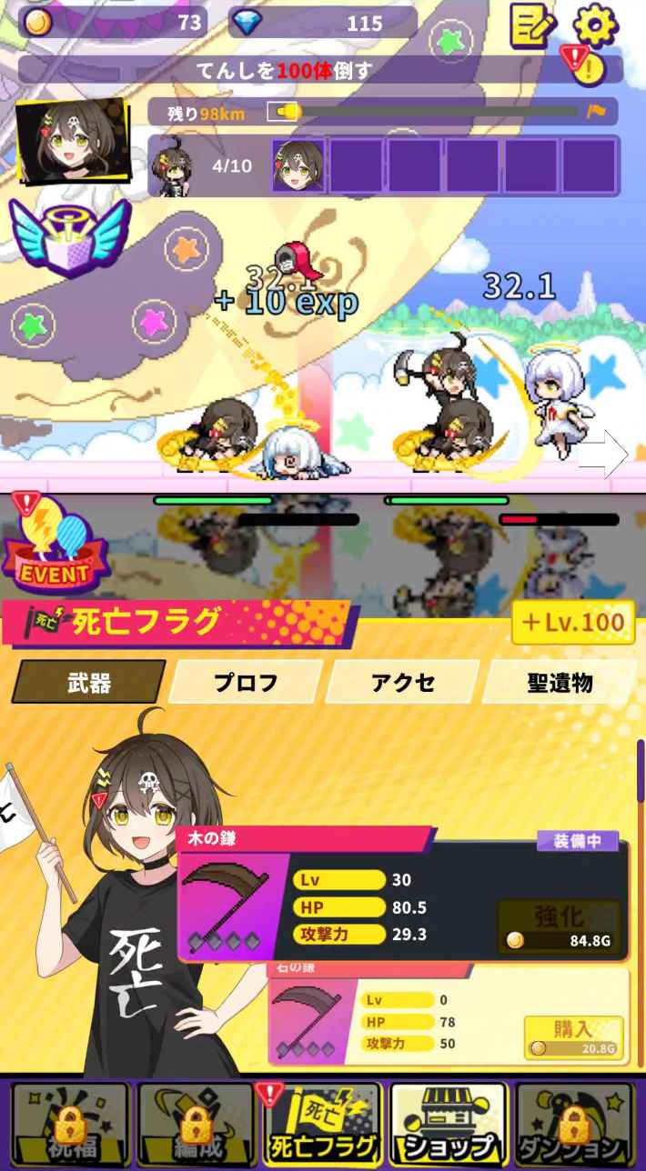 本作は、キャラクター成長を基軸とする、一般的な放置ゲームのフォーマットをベースにしており、「攻撃力」や「HP」などの基礎ステータスを地道に成長させることで、天使との戦いを有利にしていくゲーム性となる。