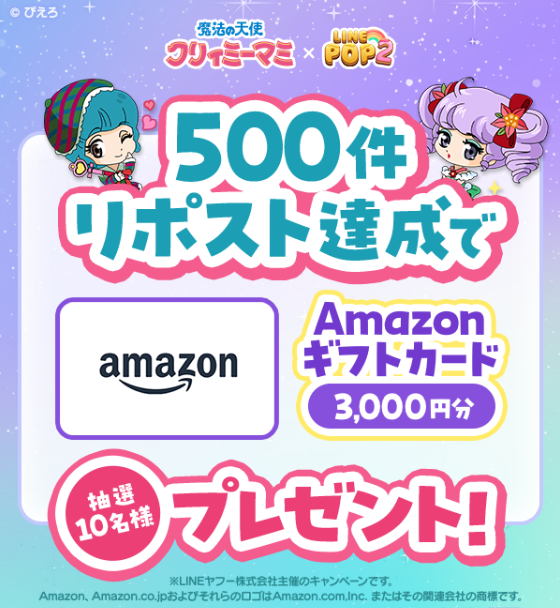 コラボ期間中、LINE POP2公式X(旧Twitter)アカウント(@LINE_POP2_JP)をフォローし、投稿をリポストすると抽選でAmazonギフトカード 3,000円分が当たります。