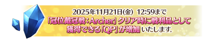 ※戦利品として獲得できる「QP」の増加は今回限定となり、2025 年 11 月 21 日(金) 13:00 以降の「冠位戴冠戦:Archer」や再度「ストーム・ポッド」の消費なしで挑戦できるようになった場合は、戦利品の「QP」は増加いたしません。